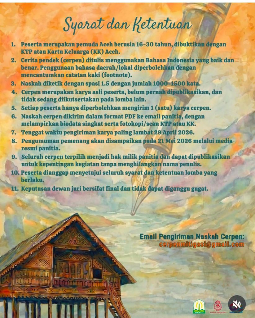 Panitia Sayembara Menulis Cerpen Piala Gubernur Aceh secara resmi mengumumkan syarat dan ketentuan bagi peserta yang ingin mengikuti ajang tersebut. Kompetisi ini ditujukan bagi pemuda Aceh berusia 16 hingga 30 tahun yang dibuktikan dengan identitas resmi seperti KTP atau Kartu Keluarga. Dalam ketentuannya, peserta diwajibkan menulis cerpen menggunakan Bahasa Indonesia yang baik dan benar. Namun, […]