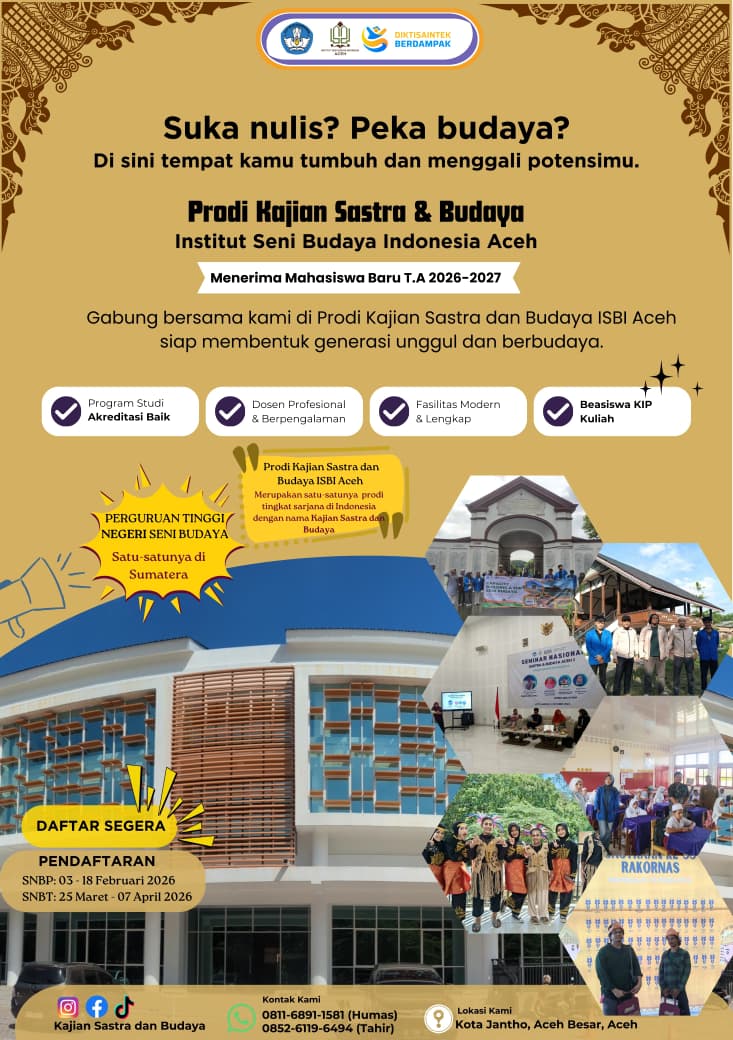 Berita Prodi Kajian Sastra dan Budaya ISBI Aceh Buka Penerimaan Mahasiswa Baru T.A. 2026/2027 Januari 20, 2026 Tidak ada komentar