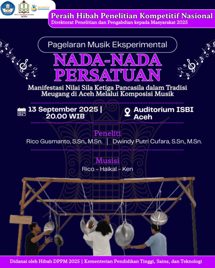 Nada-Nada Persatuan: Musik Eksperimental Angkat Nilai Pancasila dari Tradisi Aceh Banda Aceh – Auditorium ISBI Aceh akan menjadi saksi sebuah peristiwa seni istimewa lewat pagelaran musik eksperimental bertajuk “Nada-Nada Persatuan”, yang digelar pada Sabtu, 13 September 2025 pukul 20.00 WIB. Karya ini lahir dari penelitian hibah kompetitif nasional DPPM 2025 oleh Rico Gusmanto, S.Sn., M.Sn. […]