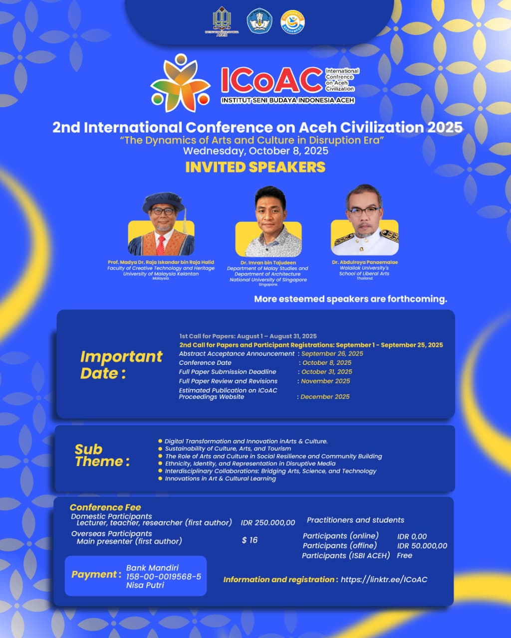 Institut Seni Budaya Indonesia (ISBI) Aceh kembali meneguhkan perannya sebagai pusat pengembangan ilmu seni dan budaya dengan menyelenggarakan Konferensi Internasional ke-2 tentang Peradaban Aceh (2nd International Conference on Aceh Civilization/ICoAC) 2025. Konferensi ini akan berlangsung pada Rabu, 8 Oktober 2025, mengusung tema besar “Dinamika Seni dan Budaya di Era Disrupsi”.