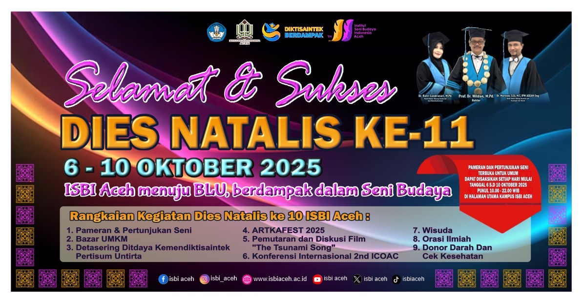 Institut Seni Budaya Indonesia (ISBI) Aceh menggelar Dies Natalis ke-11 pada 6–10 Oktober 2025 dengan tema “ISBI Aceh menuju BLU, berdampak dalam Seni Budaya”. Perayaan tahun ini menjadi momentum penting bagi ISBI Aceh dalam meneguhkan peran sebagai pusat pengembangan seni dan budaya, sekaligus mempersiapkan langkah menuju status Badan Layanan Umum (BLU).