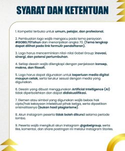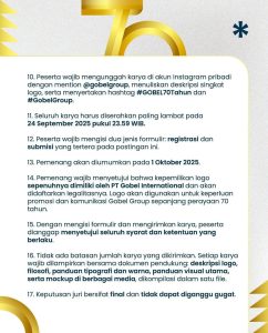 Peserta wajib mengunggah karya melalui akun Instagram pribadi dengan mention @gobelgroup, menyertakan deskripsi singkat logo, serta menggunakan hashtag #Gobel70Tahun dan #GobelGroup.